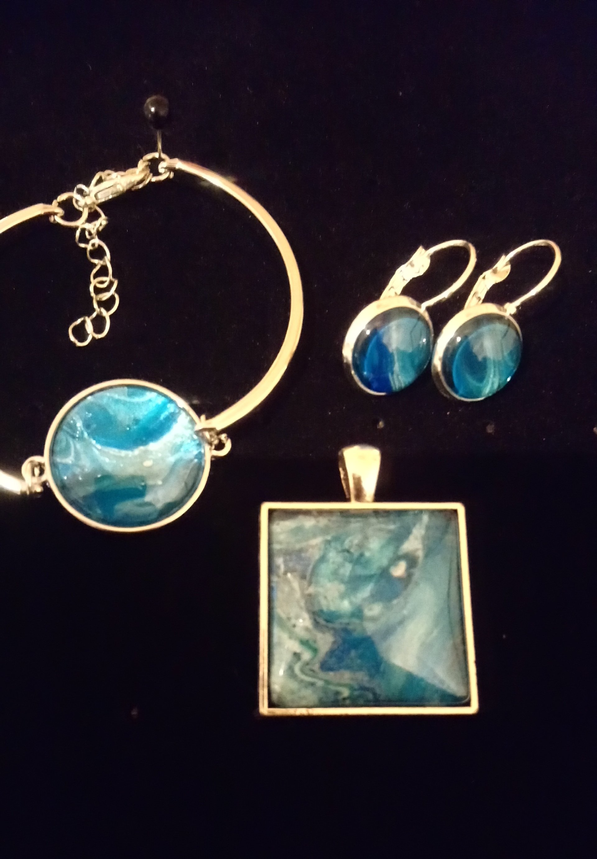 Mit Fluid Acrylics wird eine „Haut“ erzeugt, Acrylic Skin. Diese verwende ich zur Herstellung von Modeschmuck. Sämtliche Produkte sind nickelfrei, mache Kettchen mit Edelstahl mit 925 Silber überzogen. Die Bezeichnungen gold/silber/bronze usw. sind immer als Farbebezeichnung zu verstehen, nicht als Materialauskunft.